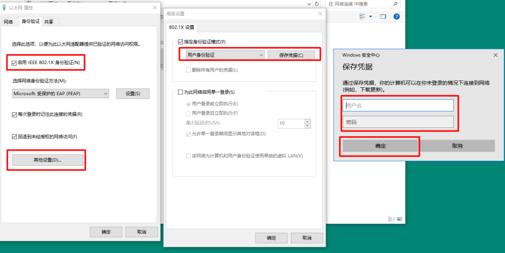 在“身份验证”页签,勾选“启用IEEE 802.1X身份验证”,设置“指定身份验证模式”为“用户身份验证”。默认用户名和密码都是名字拼音。