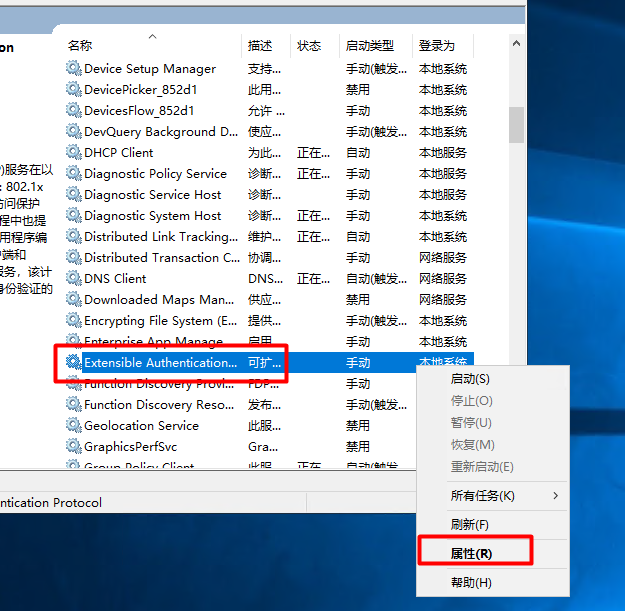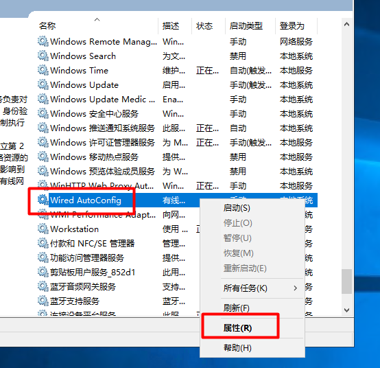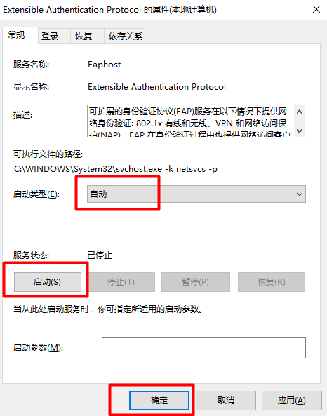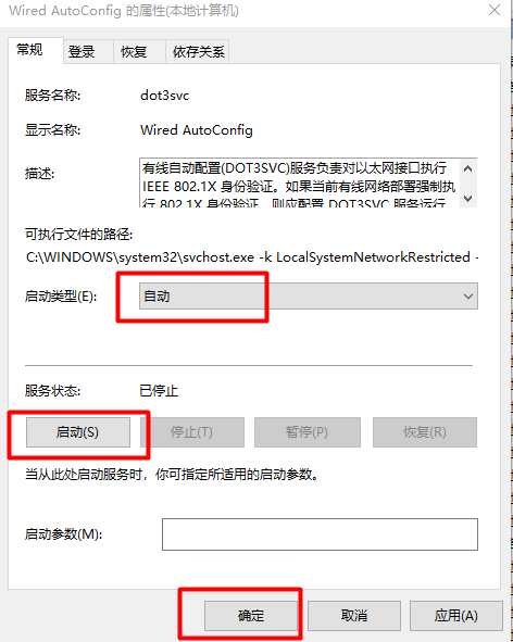 启动两个服务“Extensible Authentication Protocol”和“Wired AutoConfig”,服务的“启动类型”为“自动”。